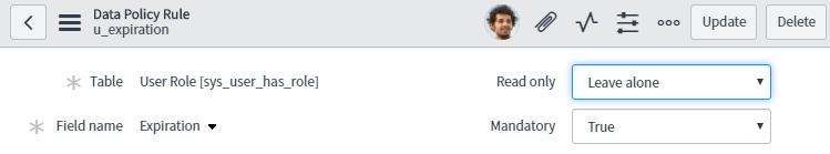 Since we can assume that all temporary roles/groups must have an expiration date, let’s create a UI Policy that’ll ensure that if the Temporary field is ticked (true) then the Expiration Date field will be both visible and mandatory; but if it is false, then the expiration date should be neither visible, n’or mandatory. And just for good measure (to ensure that no scripts or DOM-manipulation attempts to bypass our UI Policy, we’ll create a Data Policy as well.