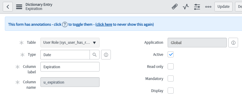 So the first thing we’ll need to do, is add some fields to the sys_user_has_role and sys_user_grmember tables. These are the m2m (many-to-many) tables where the associations between users and roles, and between users and groups are stored, respectively.