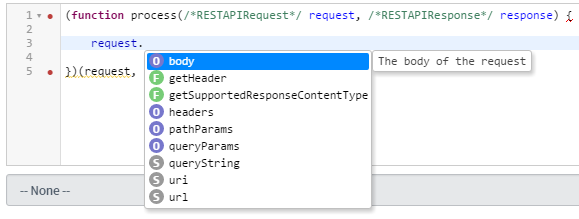 From this stub, we can tell that we’ve got access to two parameters that we can make use of, inside the process function: request (a RESTAPIRequest object), and response (a RESTAPIResponse object). If you read our article, What’s New in Geneva/UI16, you know that the Geneva script editor is far more powerful now, than it used to be. We can make use of the intellisense style code-completion, to see what methods of the RESTAPIRequest and RESTAPIResponse objects we have access to, by typing “request.” or “response.” like so:
