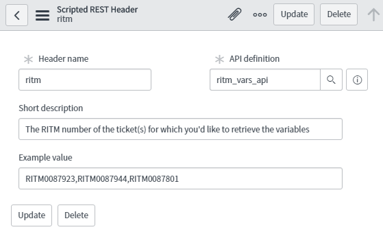 As we build a scripted API to send over the variables and variable values associated with a given request item, we’ll need to create a way for the requestor to pass in the RITM ticket numbers they’d like to retrieve the variables for.