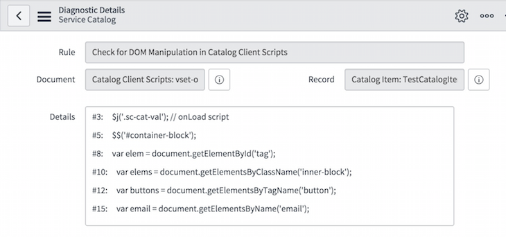 Helsinki adds some great catalog debugging functionality. A diagnostics related link has been added to catalog items, which allows you to quickly view “health” data. It checks for bad practice and performance or upgradeability-impacting factors, such as duplicate variables or DOM manipulation in catalog client scripts. It can be quite useful for narrowing down bugs or choke points, and will help you pick out synchronous AJAX calls in client scripts.