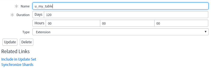 - Set the Duration field to an amount of time representing how long each table should live before another extension (AKA “shard”) should be created. I recommend setting this field to somewhere between 90 days and 180 days, depending on how active the table is (more active = lower duration). I’m going to enter 120 days here.