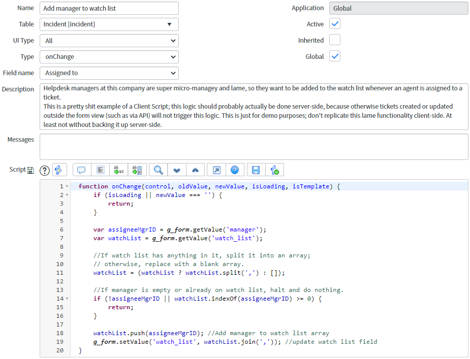 Note*: I’m going to use a regular ol’* Client Script here, but this simple method works with Catalog Client Scripts*,* UI Policy scripts*,* UI Scripts*, and even* client-side scripts in the Service Portal*! Basically, anything that executes as-written, in the user’s browser.*