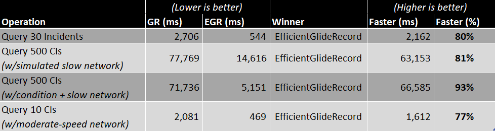 Oh my sweet summer child… even I was baffled when I did my performance testing, at just how inefficient the client-side GlideRecord is, and by just how much performance could be improved with EfficientGlideRecord.