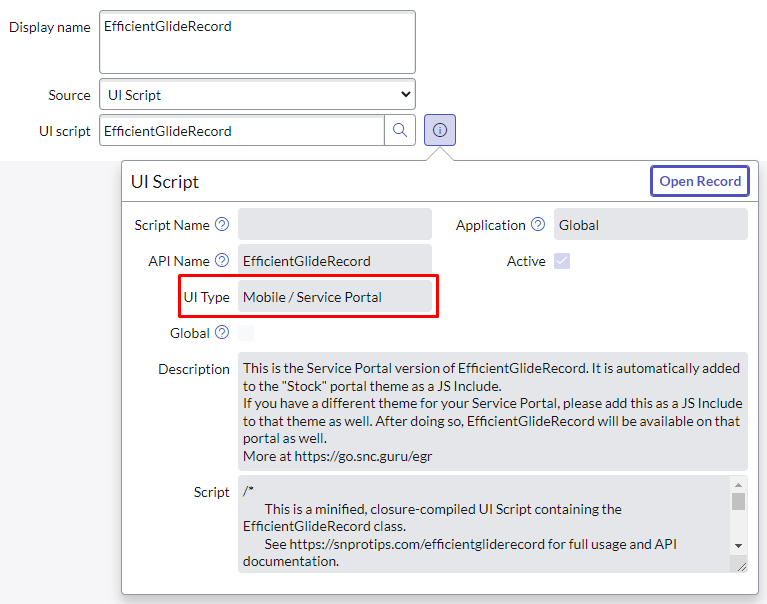 NOTE: The minified EfficientGlideRecord class (as EfficientGlideRecordPortal) has been added as a JS Include to the default “Stock” Service Portal theme by this Update Set. However, if you use a different theme on your Service Portal, please be sure to create a new JS Include, and point it to the UI Script that’s specifically marked as working with the Service Portal, as you can see in the screenshot below: